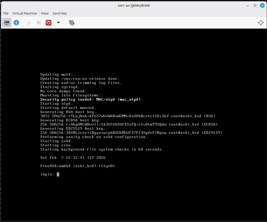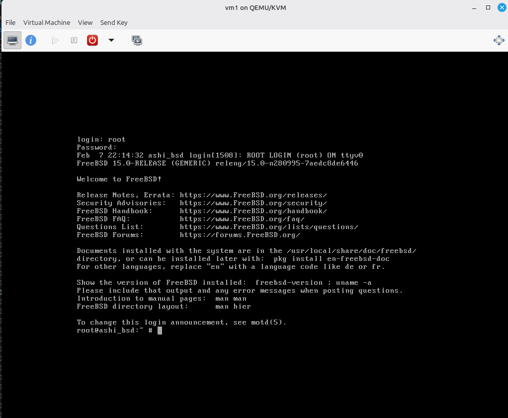 עכשיו, אחרי שנלחץ אנטר, ירוצו שורות קוד - ואחריהם, מסך Login. ואחרי הכניסה, אנחנו בShell של FreeBSD.
