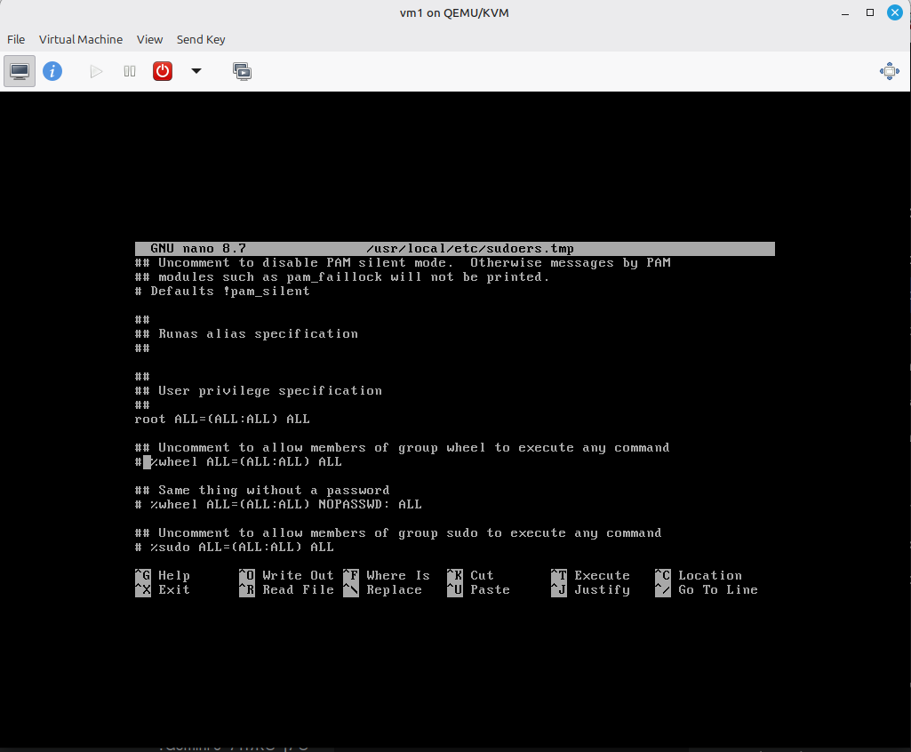 3) כפי שהסברתי למעלה, sudo אינו כלי נייטיבי בFreeBSD. לכן, גם אחרי שהמשתמש שלנו נמצא בקבוצת wheel, sudo - “שלא מכיר” את הקבוצה הזו כקבוצה עם הרשאות מיוחדות - לא יתן לנו הרשאות. לכן, נצטרך לערוך את קובץ הקוניפגורציה שלו.
