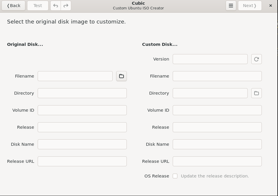 לאחר מכן, נתקין את תוכנת Cubic (Custom Ubuntu ISO Creator), היא עובדת גם בWSL. נפתח את התוכנה ונבחר תיקיה לפרוייקט:
