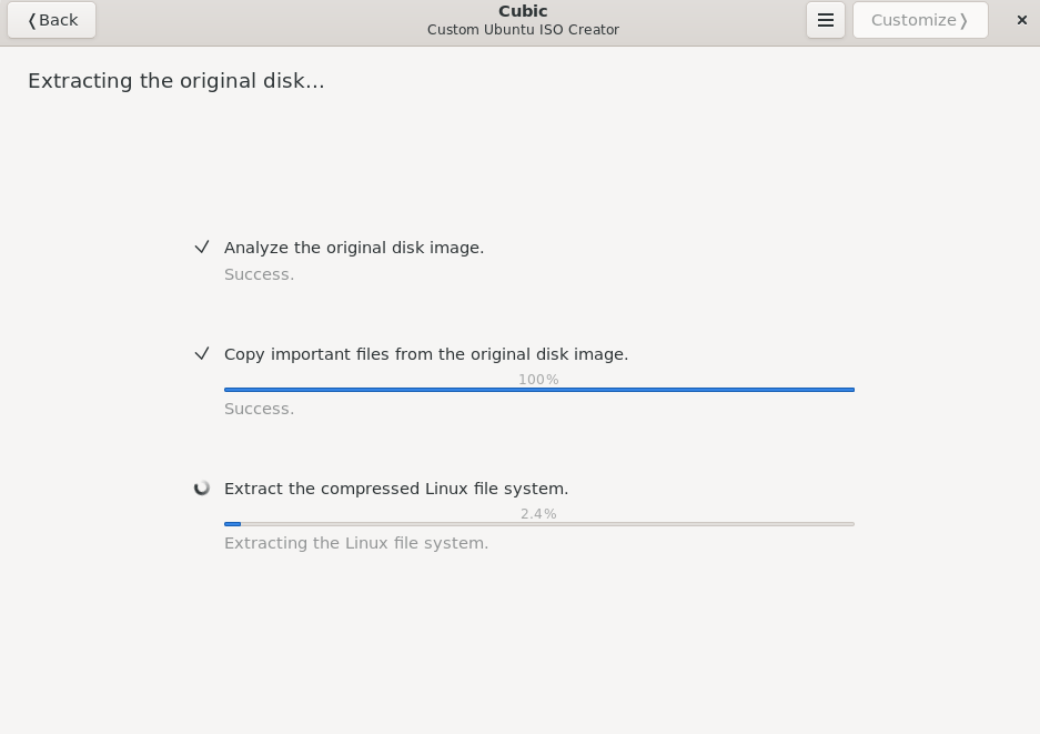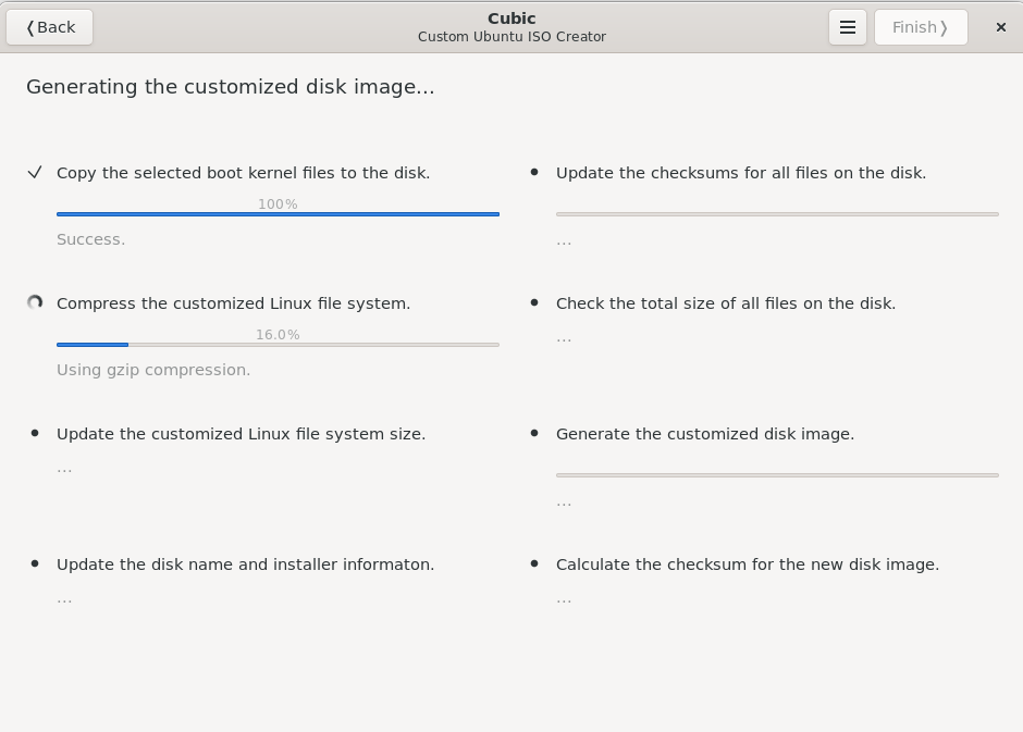 נחכה לסיום הסגירה והיצירה של הiso, ובשני המסכים הבאים אני ממליץ להשאיר הכל כמו במקור (אפשר לבחור איזה חבילות יוסרו במהלך ההתקנה למרות שזמינות בסביבת הלייב, איזה קרנל להשתמש ואיזו שיטת דחיסה. לא מומלץ להתעסק בלי הבנה) ונחכה לסיום: