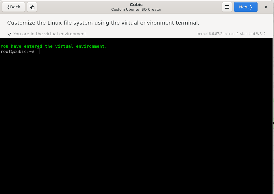 בעצם, עכשיו השמיים הם הגבול - אנחנו בתוך הshell של הiso שבחרנו להתאים! אנחנו יכולים להתקין תוכנות, להסיר תוכנות (אני למשל החלפתי את ליברה אופיס בOnlyOffice), לשנות הגדרות, להוסיף מאגרי ppa… בקיצור, כל מה שאפשר דרך הטרמינל. בסיום, כמובן, נלחץ על Next.